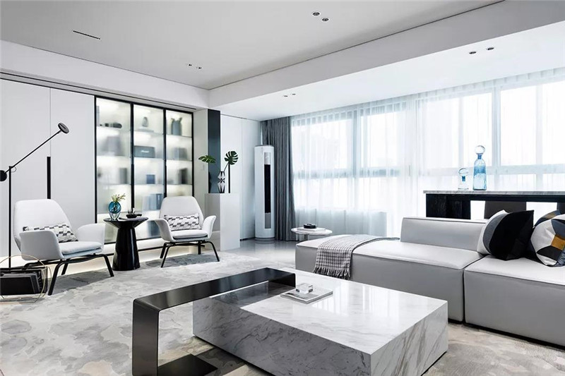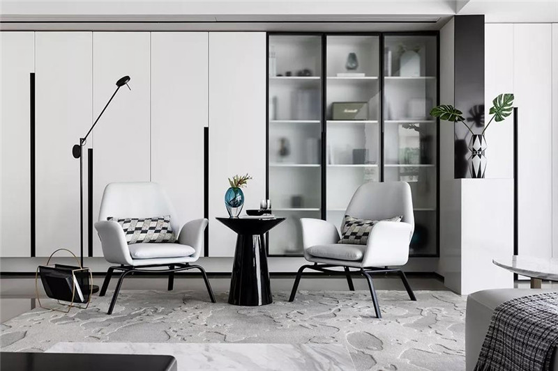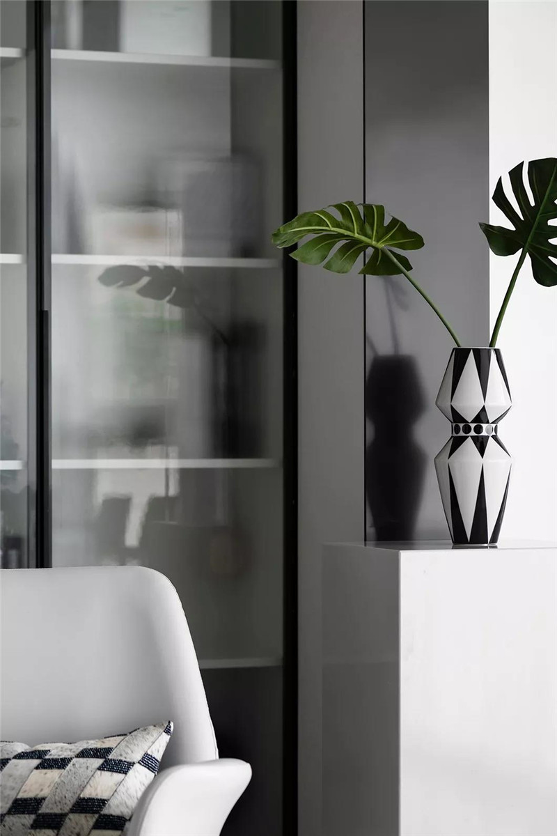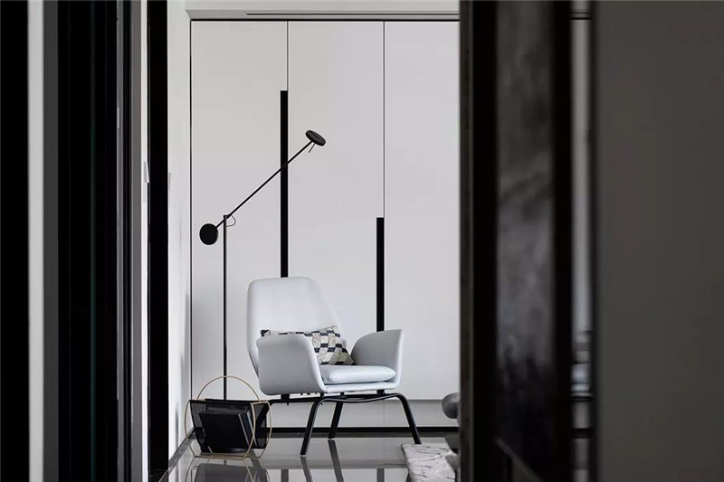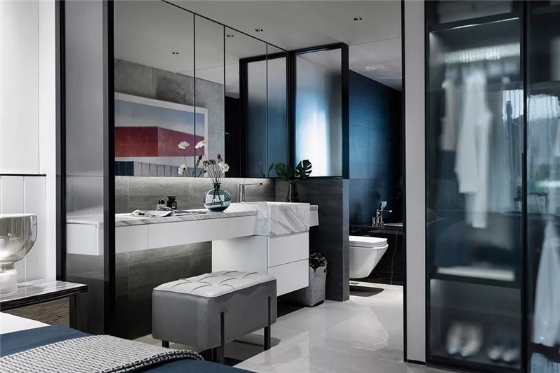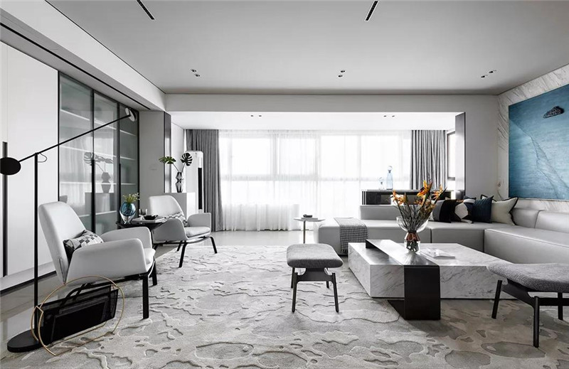 本案从空间布局和界限上突破常规思路,传达的是熟悉中有惊喜,常规中有新意。黑白灰的基色搭配静谧的蓝,跳跃而灵动。在表象的视觉之下,设计师极尽克制,投射出空间的美学与艺术的张力。
