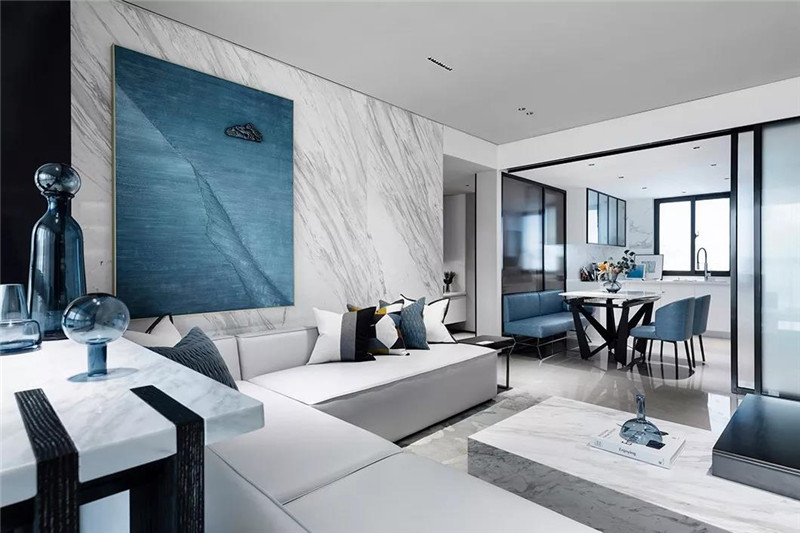 客厅空间摈弃了繁复的装饰,以细节放大我们的感受与空间想象。大理石背景墙上漾开的蓝色水波打破空间的内敛,传递卓绝群伦的个性。光影流动间,似是远山的露霭,营造出自然纯粹之美。