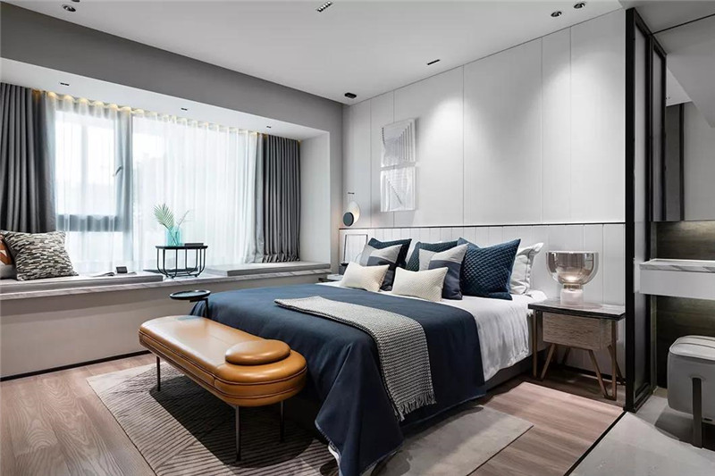主卧空间,以简约的设计手法构筑纯粹的生活情境。沉稳的蓝色作为主色调引导空间情绪,“线”与“形”的元素贯穿整个场域,静谧与质感的格调氤氲而生。