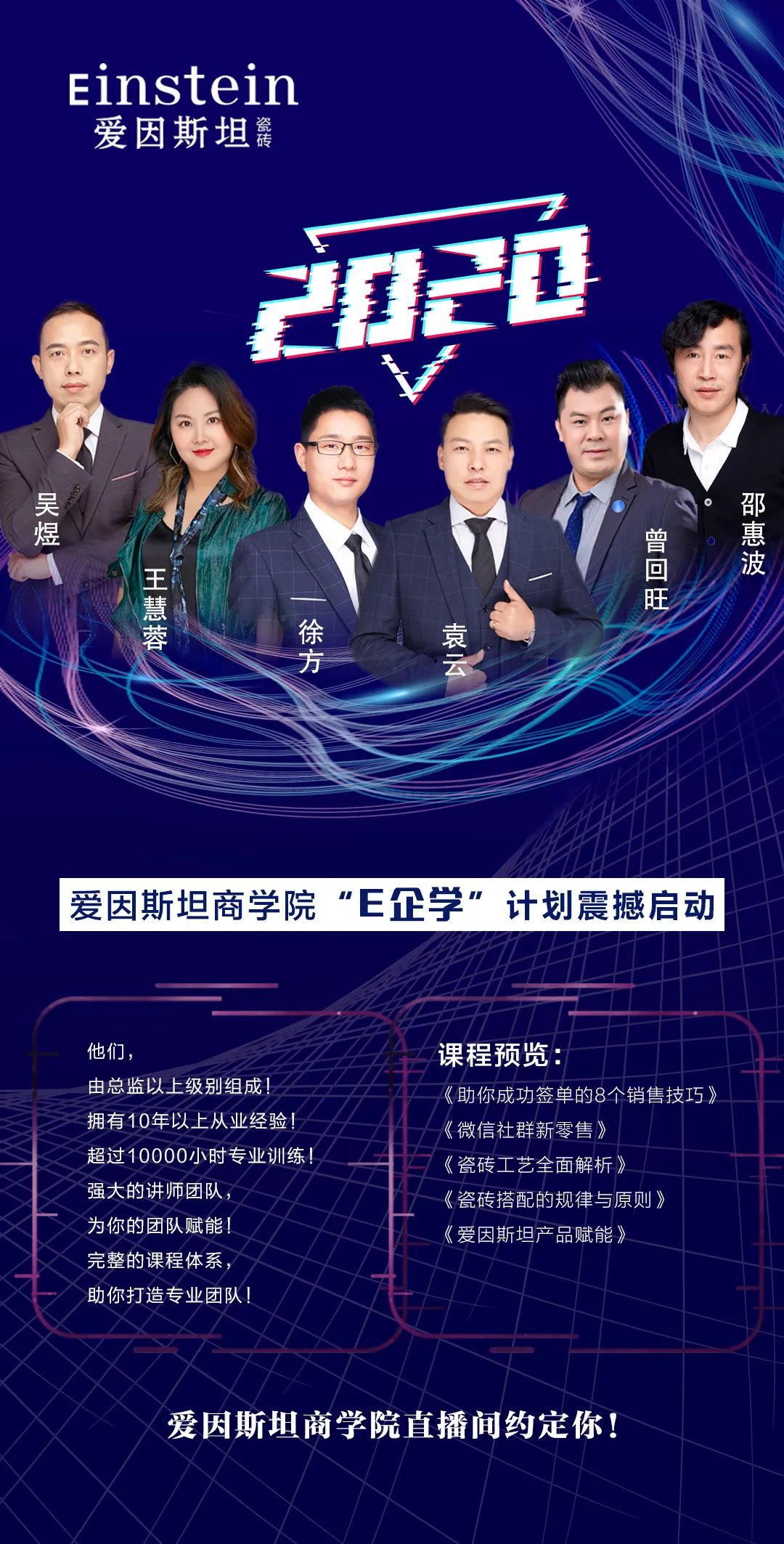 4月10日,爱因斯坦瓷砖商学院推出了“E企学”学习计划震撼启动,开启了全天工作时间的线上设计、共享展厅、线上培训的直播活动。在斗鱼、抖音、云视联等直播间,推出以营销、团队、渠道、产品、设计为核心的,商学院“E企学”直播课程,全年累计超300场,受众经销商超20W人次。