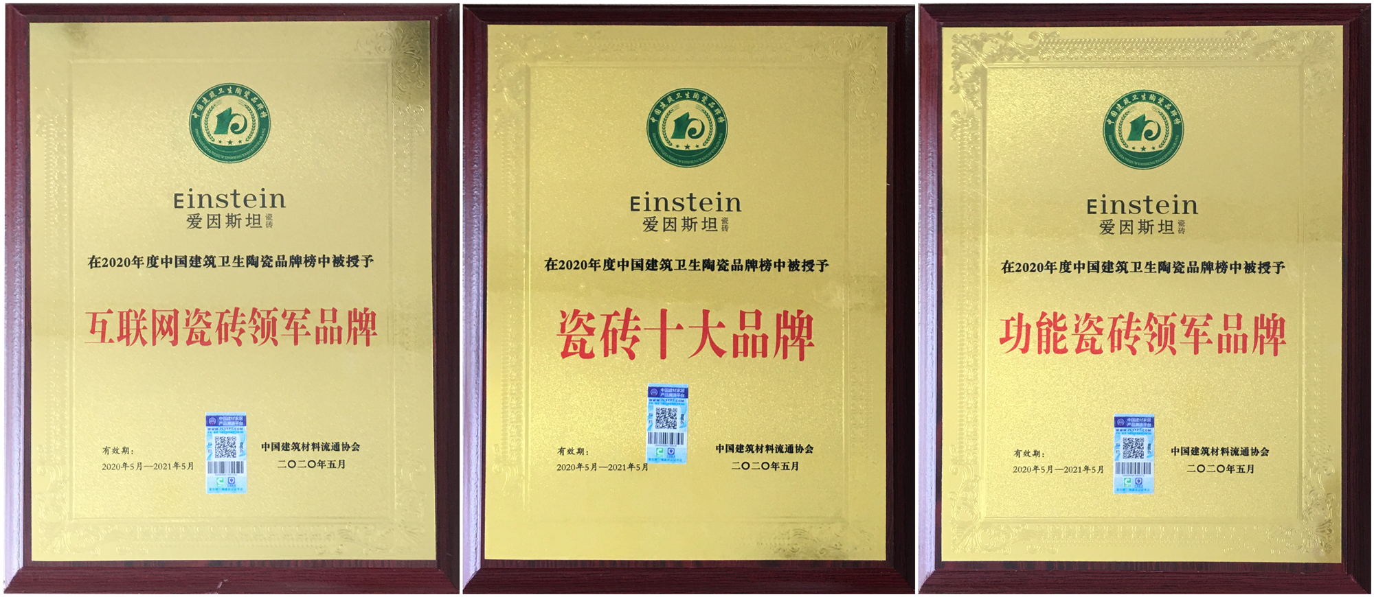 5月22日,在2020第六届全国陶瓷/卫浴经销商大会暨第九届中国建筑卫生陶瓷品牌年会上,爱因斯坦瓷砖董事长袁云受邀出席高峰论坛。爱因斯坦瓷砖凭借强劲的品牌实力和市场口碑,一举斩获”互联网瓷砖领军品牌”、”瓷砖十大品牌”、”功能瓷砖领军品牌”三项荣誉大奖!
