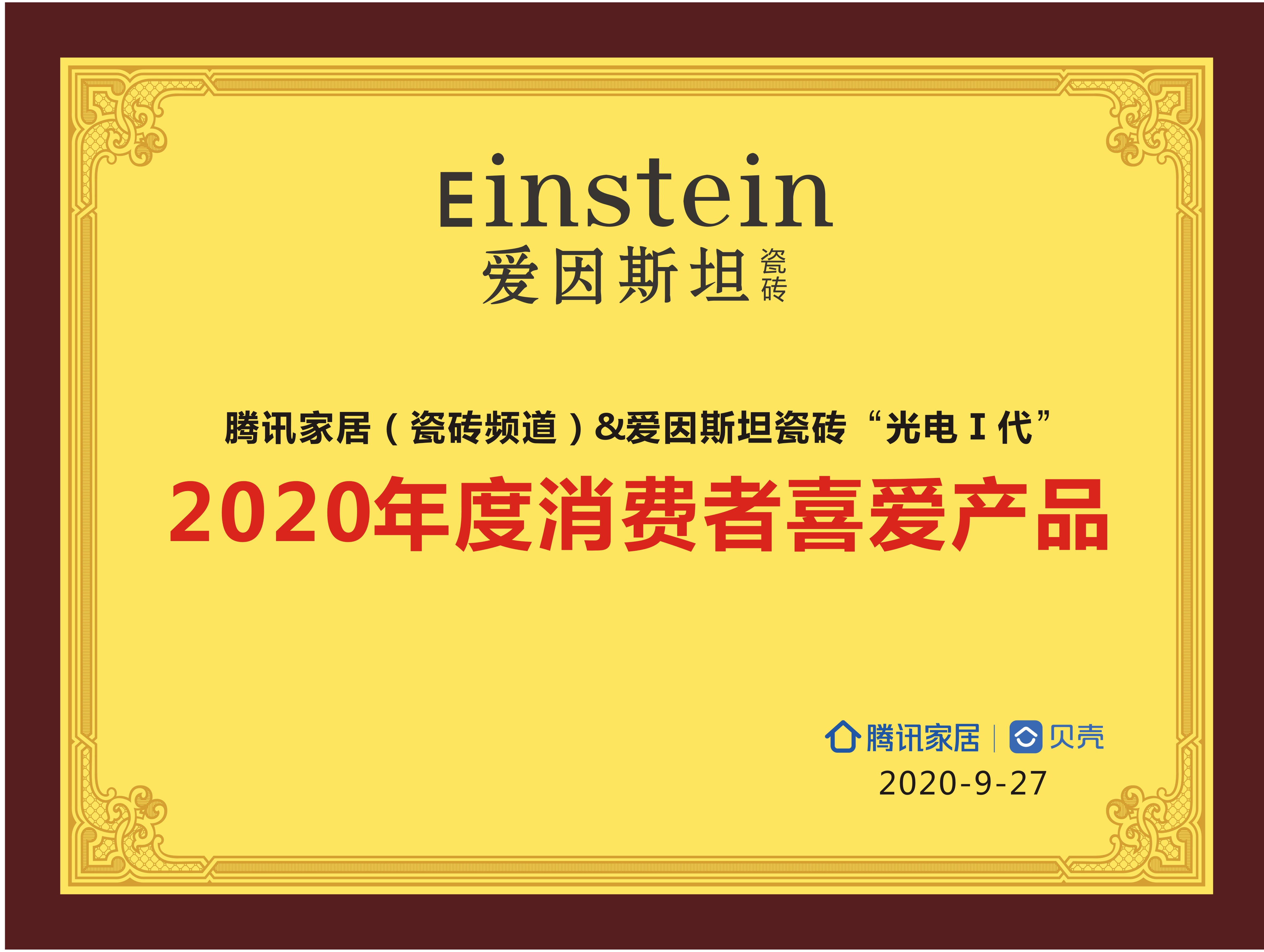 9月27日,爱因斯坦瓷砖“光电Ⅰ代”系列产品,荣获由腾讯家居频道、贝壳装饰联合颁发的“2020年度消费者喜爱产品”荣誉证书。