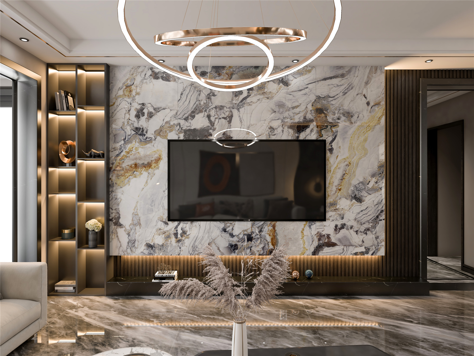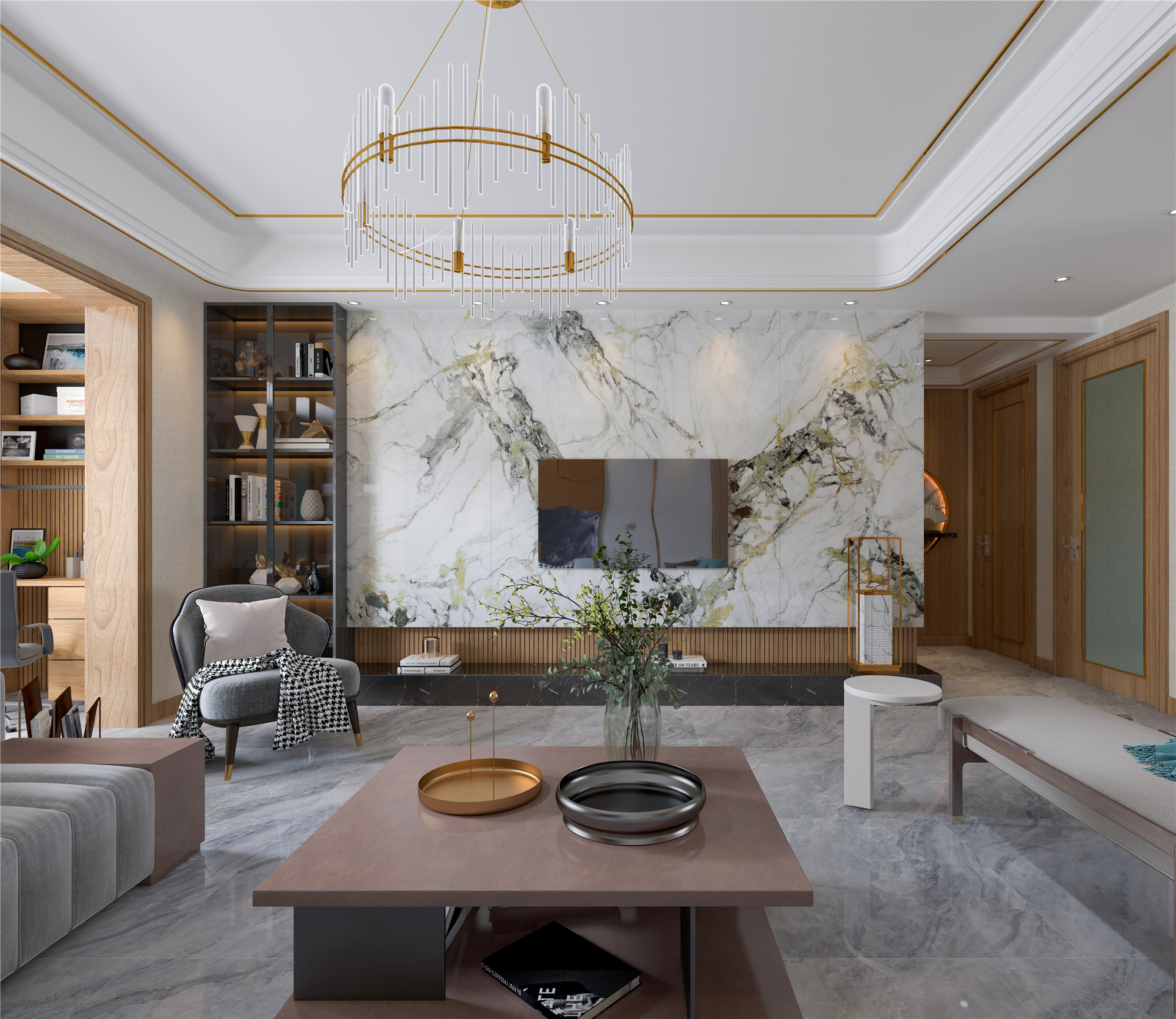 在带着自然大气的纹理的瓷砖,和金属、玻璃、原木等元素组成的轻奢风客厅,不需要过都华丽的装饰,或者是浮夸的造型,材质本身自带的高级感、华丽感,就能够将空间的精致感呈现的淋漓尽致。