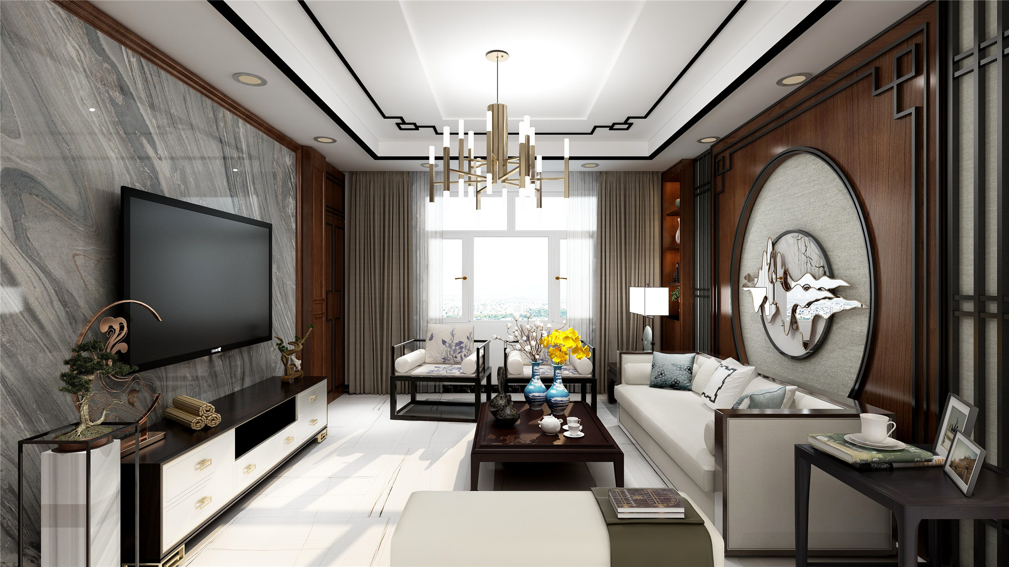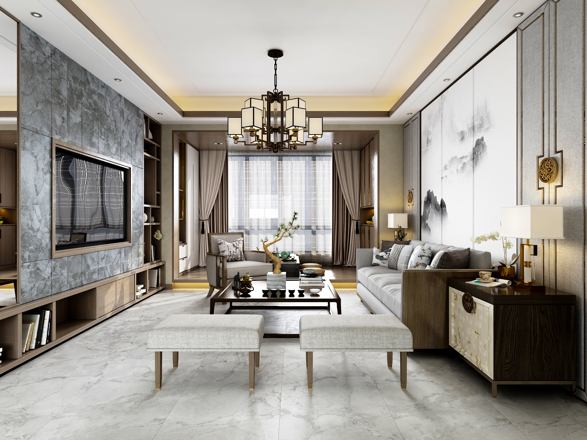 新中式风格擅长把中式元素与现代素材巧妙融合,有温度,有情感,为传统家居文化注入新气息。以中式韵调为基点,地面采用纹理缥缈的灰调施华洛世奇,在宁静中多了一丝清新、在稳重中多了一份自然气息,将室内的生机瞬间焕发。