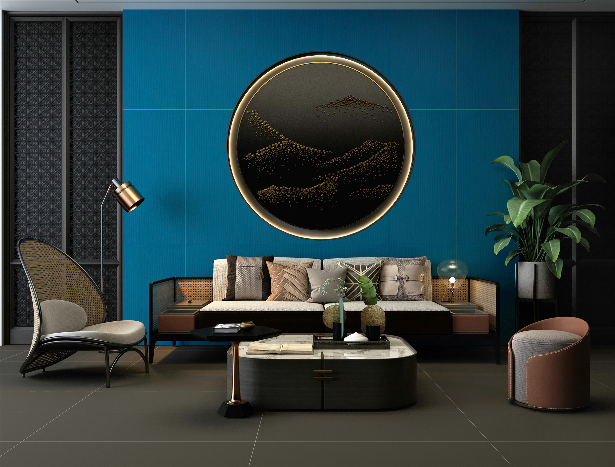 蓝色是在家居设计中最常用的颜色之一,从温柔平和到刚强有力量,从尊贵端庄到散漫自由,它可以适应每种性格和风格。当复古蓝与经典黑相组合,于精致中透着有趣,每一处的小细节都透露出别致优雅的家居气质。