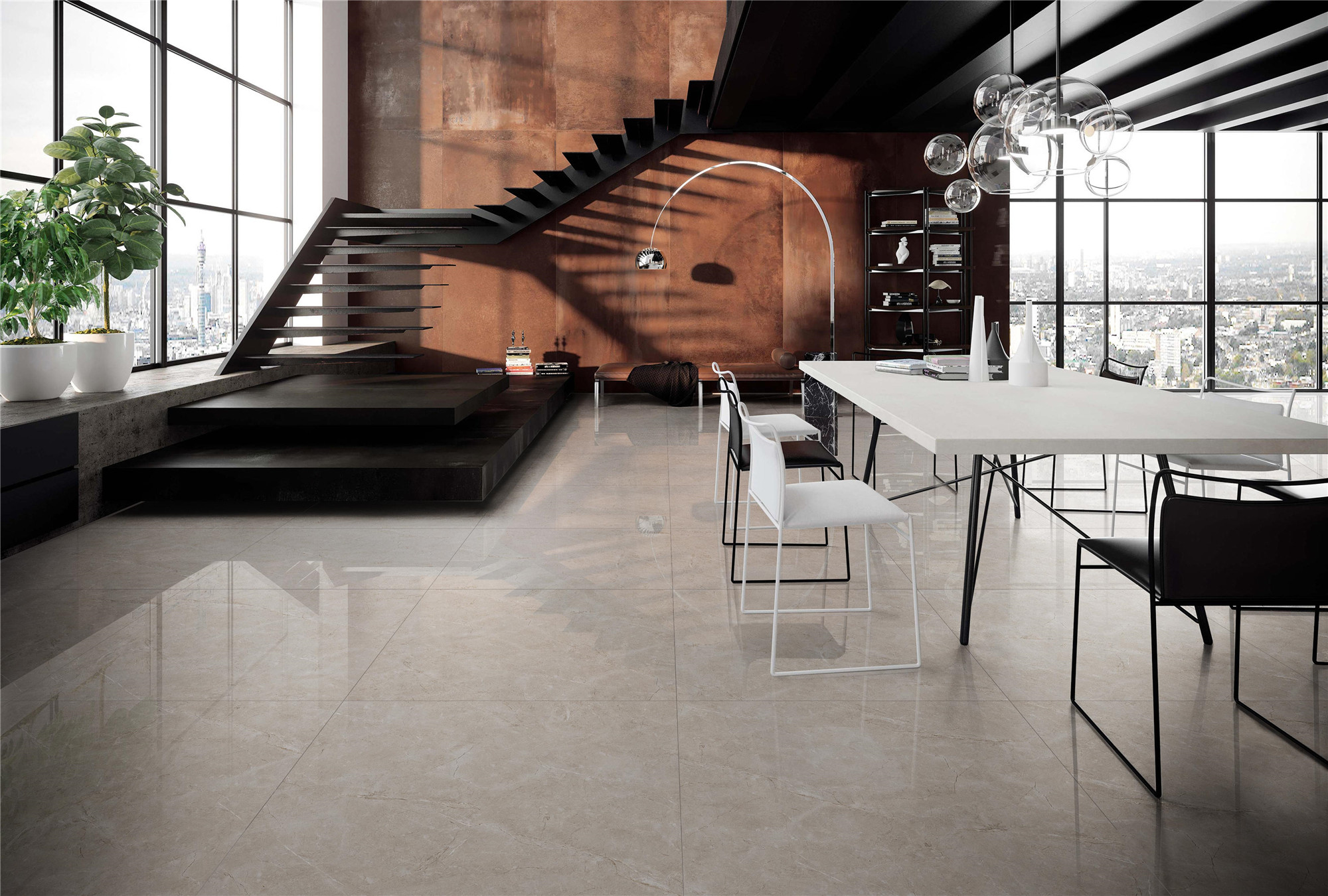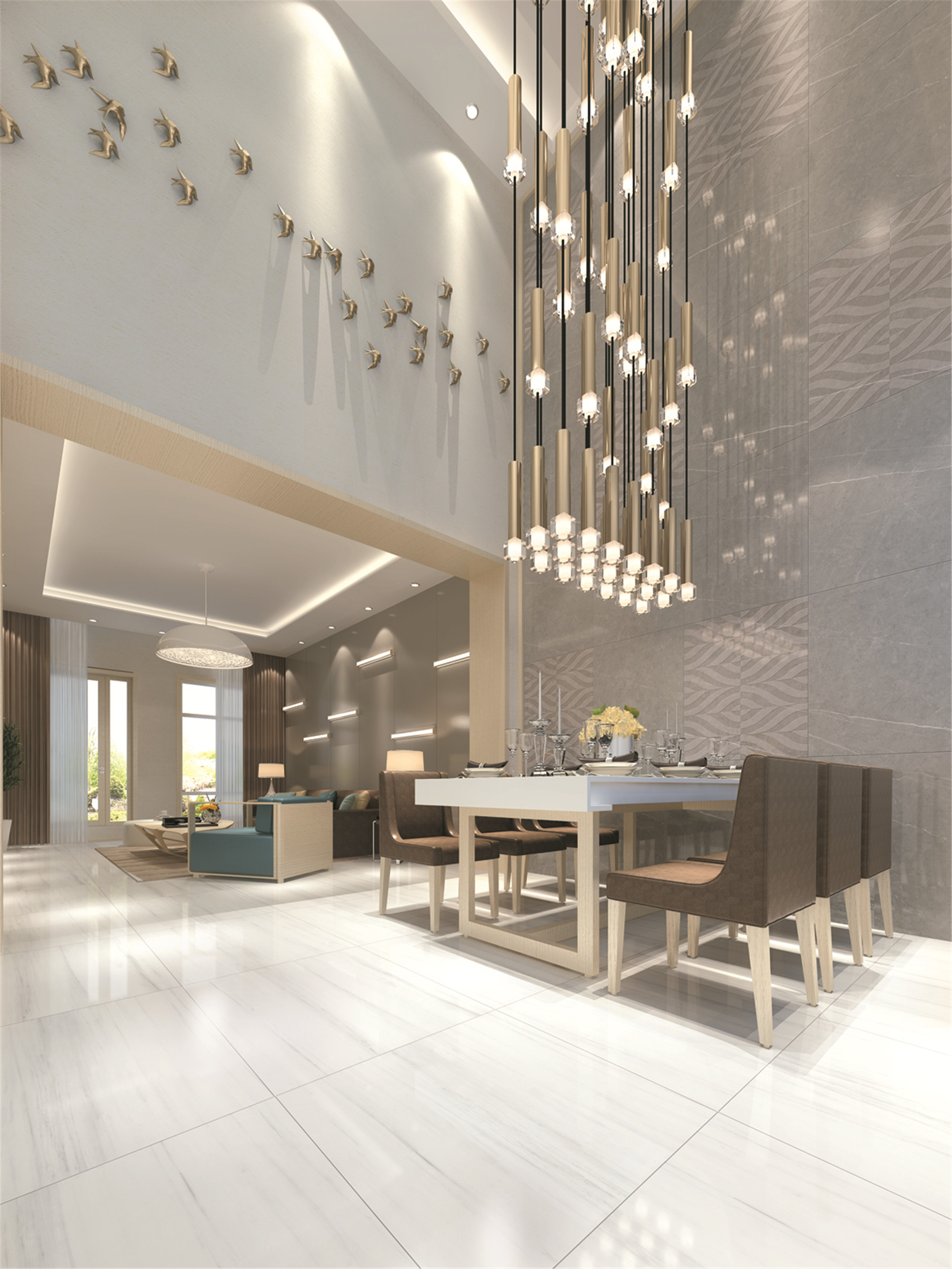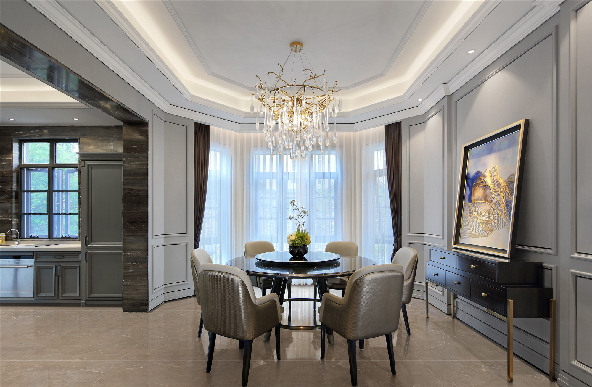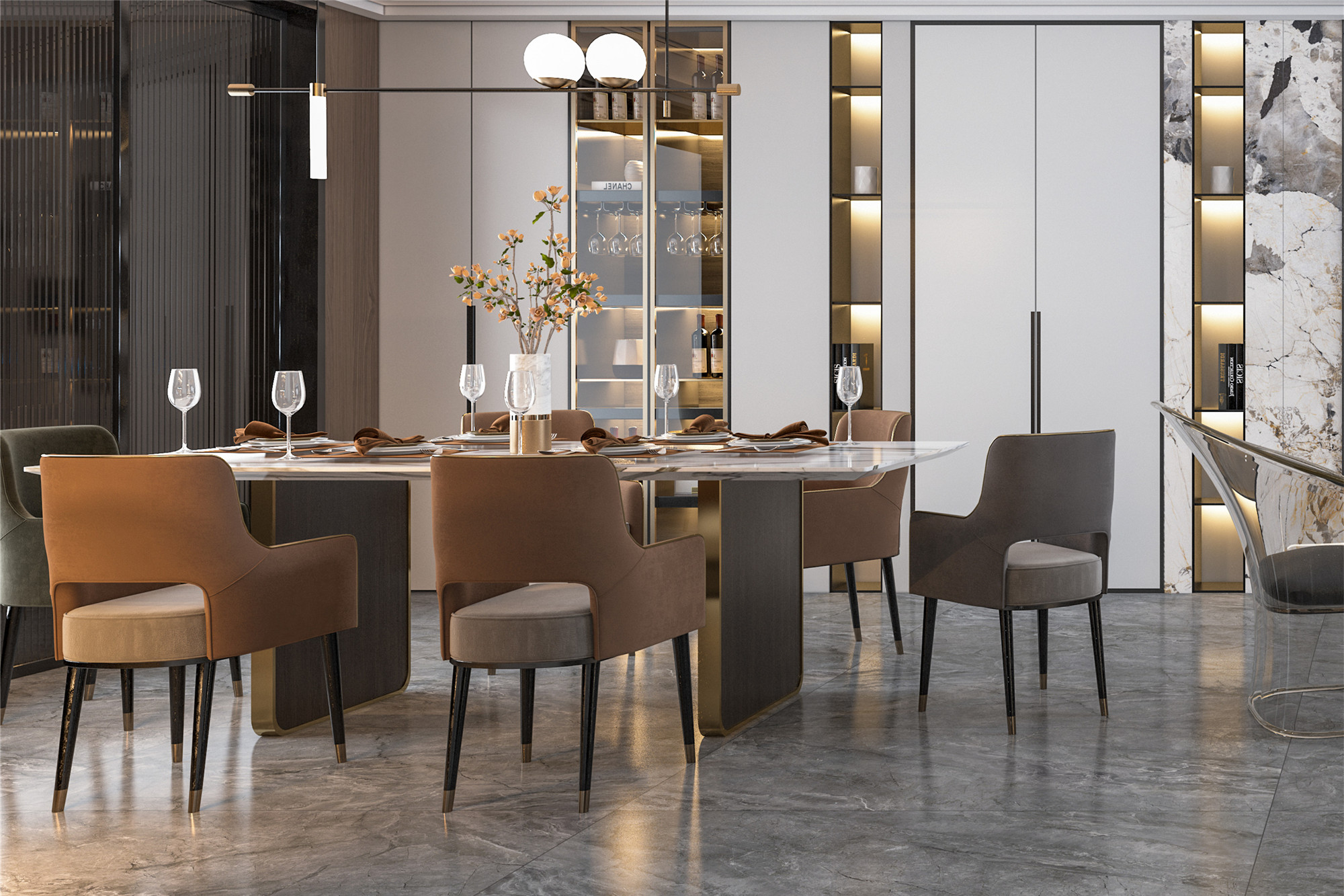 咖啡色的餐桌椅和珍珠白的餐边柜,