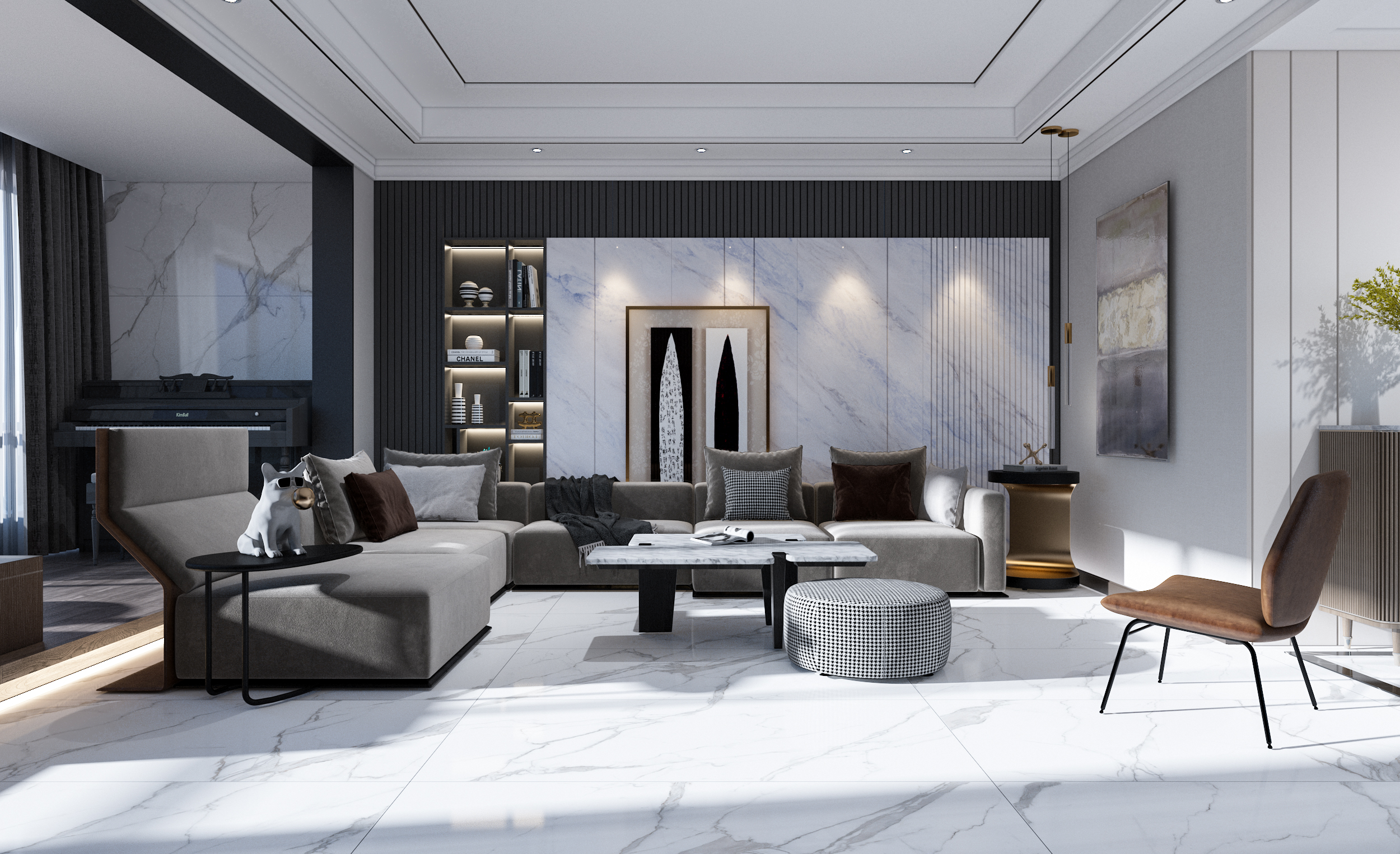 贝尔格蓝以蓝白色为底,深浅有致的蓝灰色纹理,自然延伸开来,如同被雨水洗净的蔚蓝色的天空,为家居空间增添尊贵典雅的气质。