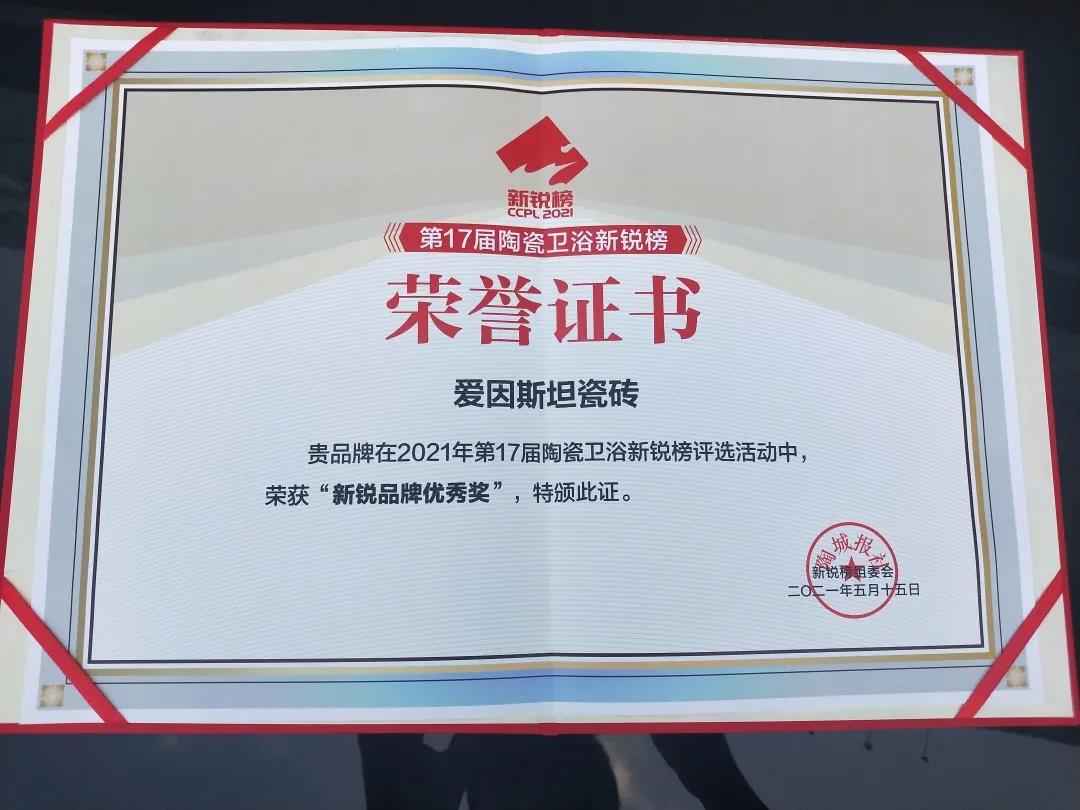 5月15日下午,第十七届中国陶瓷行业新锐榜颁奖盛典在佛山新媒体产业园隆重举行。爱因斯坦瓷砖凭借雄厚的品牌实力和和卓越创新能力,在行业众多知名品牌中脱颖而出,一举夺得新锐榜重量级荣誉——“新锐品牌优秀奖”,成为陶瓷行业年度表现优秀、具有新兴力量的品牌!