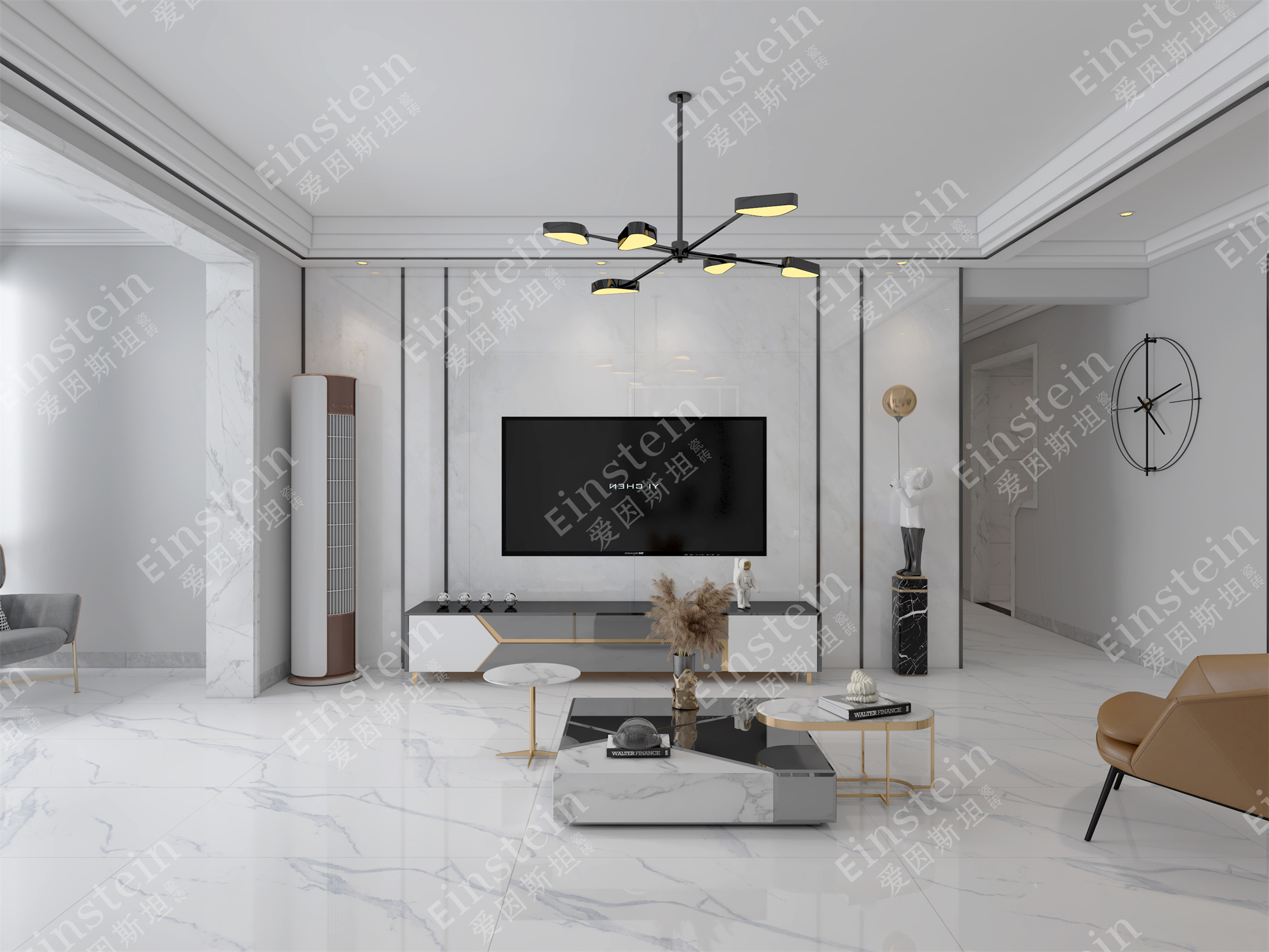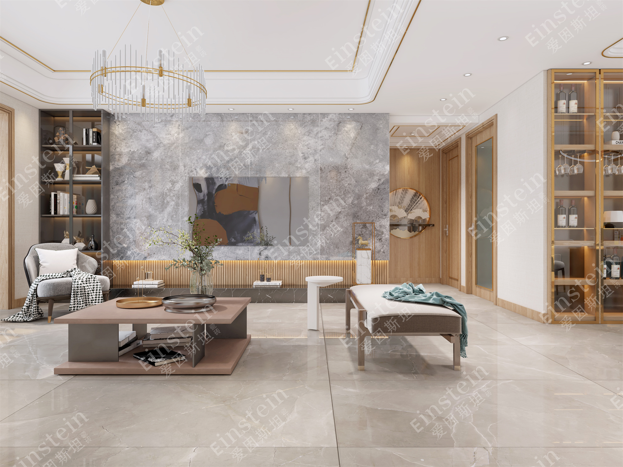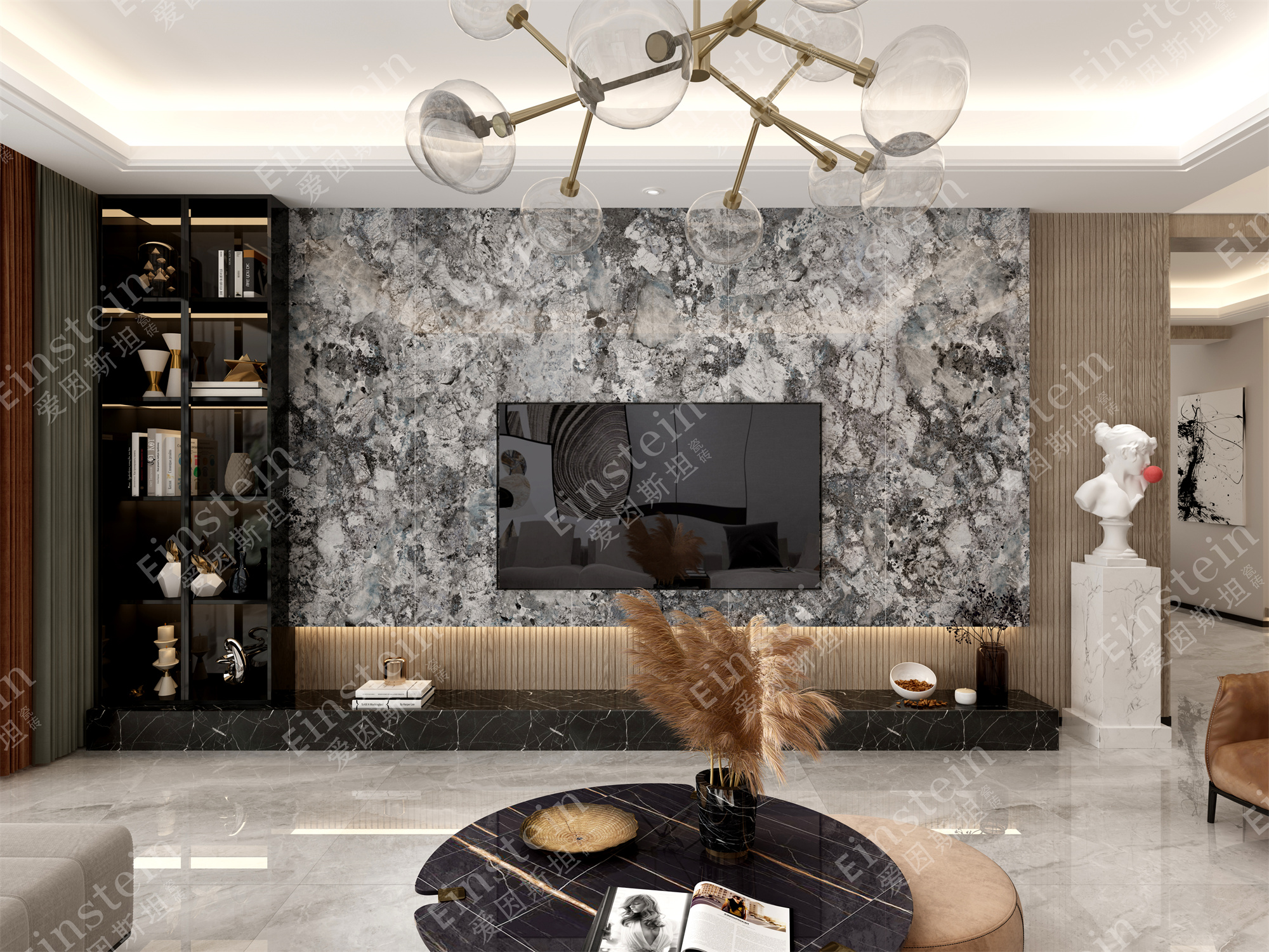 正如爱因斯坦瓷砖岩板系列产品,利用先进的科技工艺,将自然之美融合在岩板上,利用低饱和度的黑白灰色系,使岩板脱胎于自然的本质、