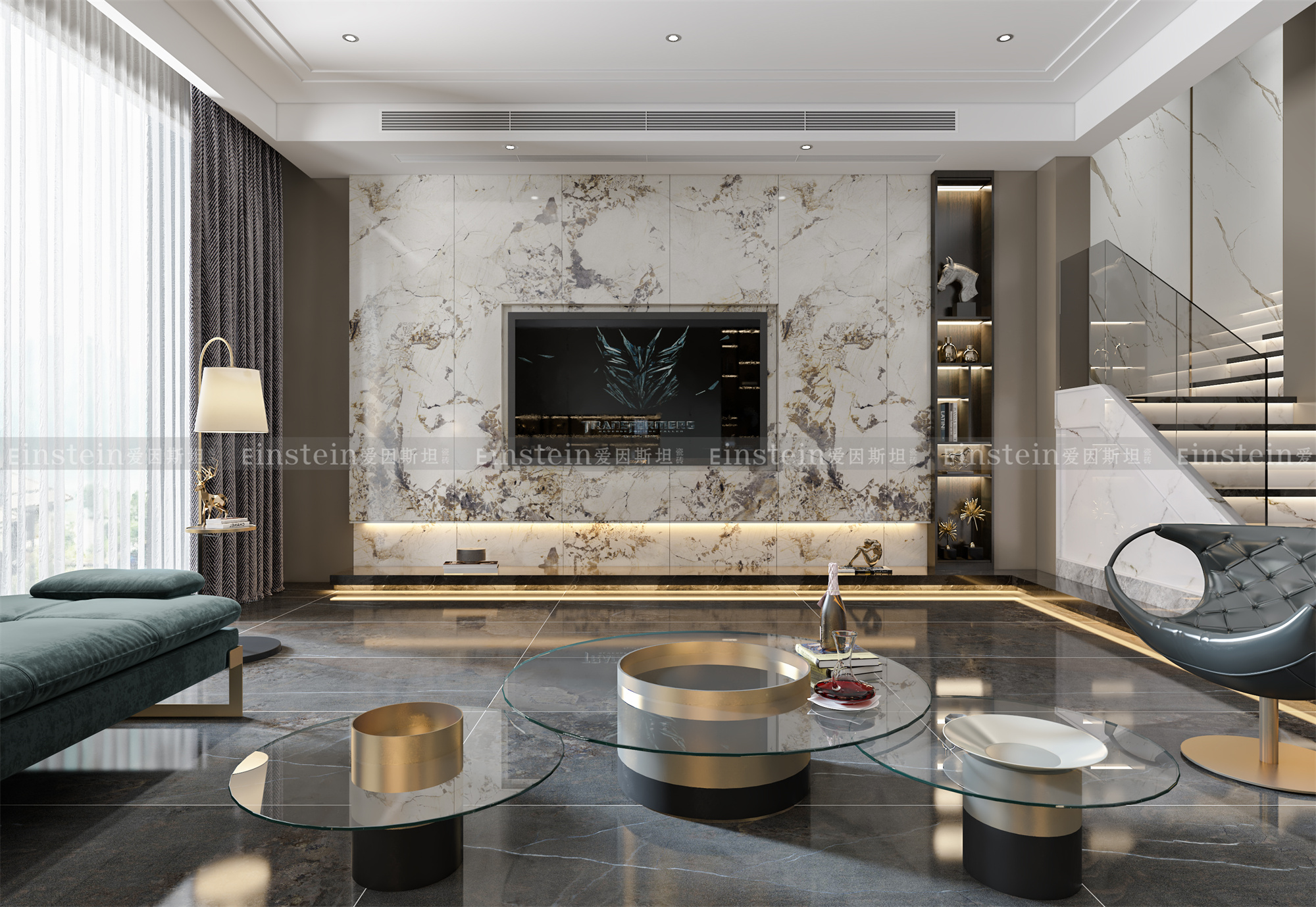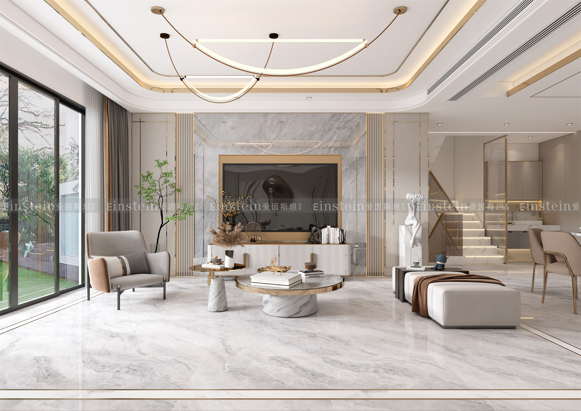 在轻奢风里,多用到本身自带高级感、华丽感的元素,例如大理石、瓷砖、金属、玻璃、镜面等,与生俱来的优雅感和高级感,能让空间熠熠生辉。