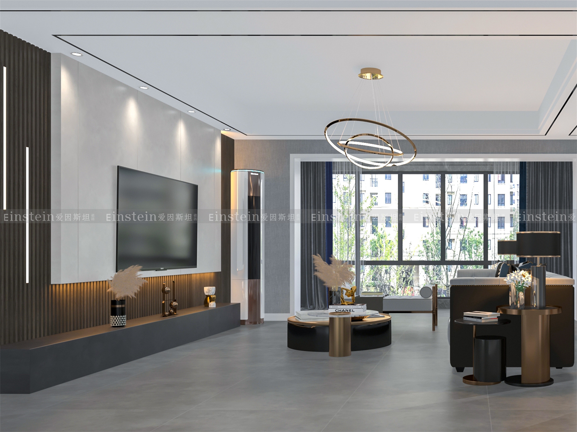 利用白色、金属色与暗影灰作层层叠加使用,让客厅变得更加宁静的同时,又不失高级感和时尚感。