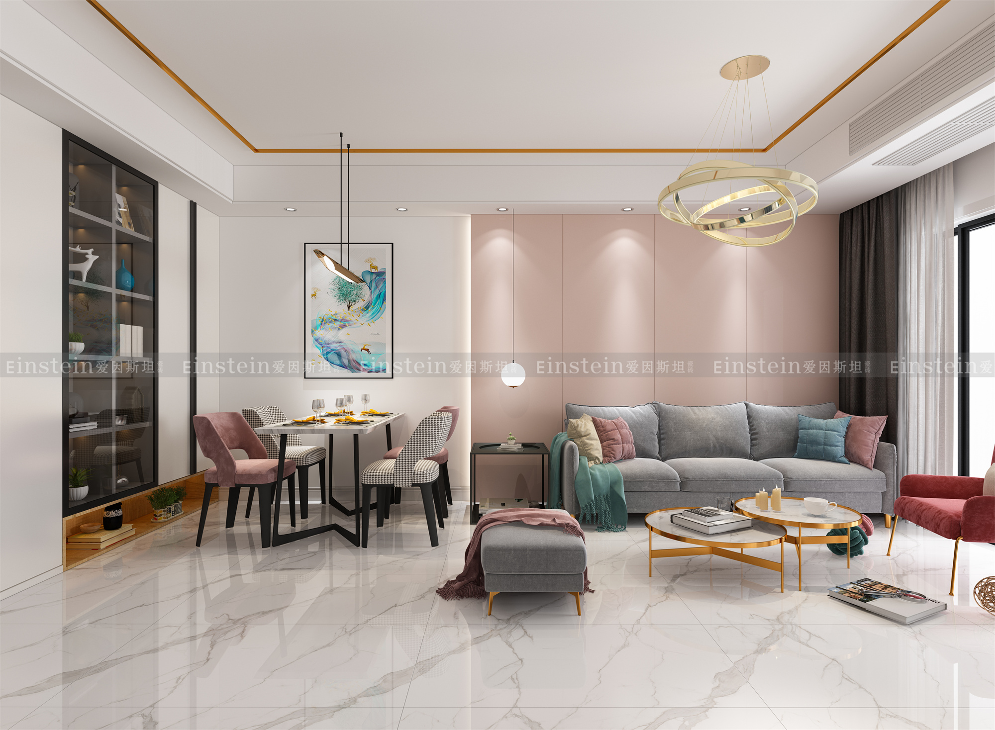 粉色和白色叠加使用,充分打造出空间的色彩层次感,而灰色沙发的加入更突出了色彩的纯粹与高级感,打造出令人心动的恬静客厅。
