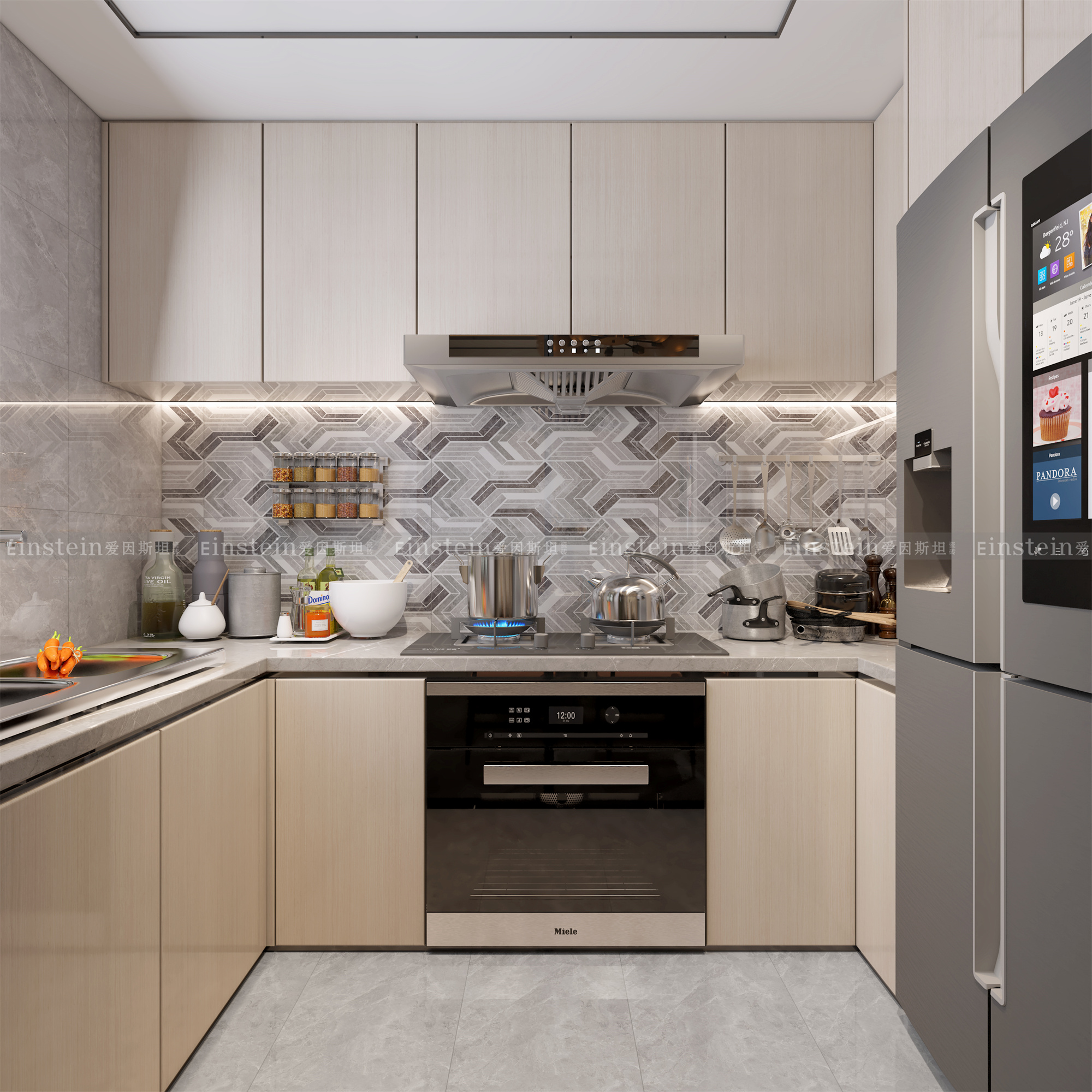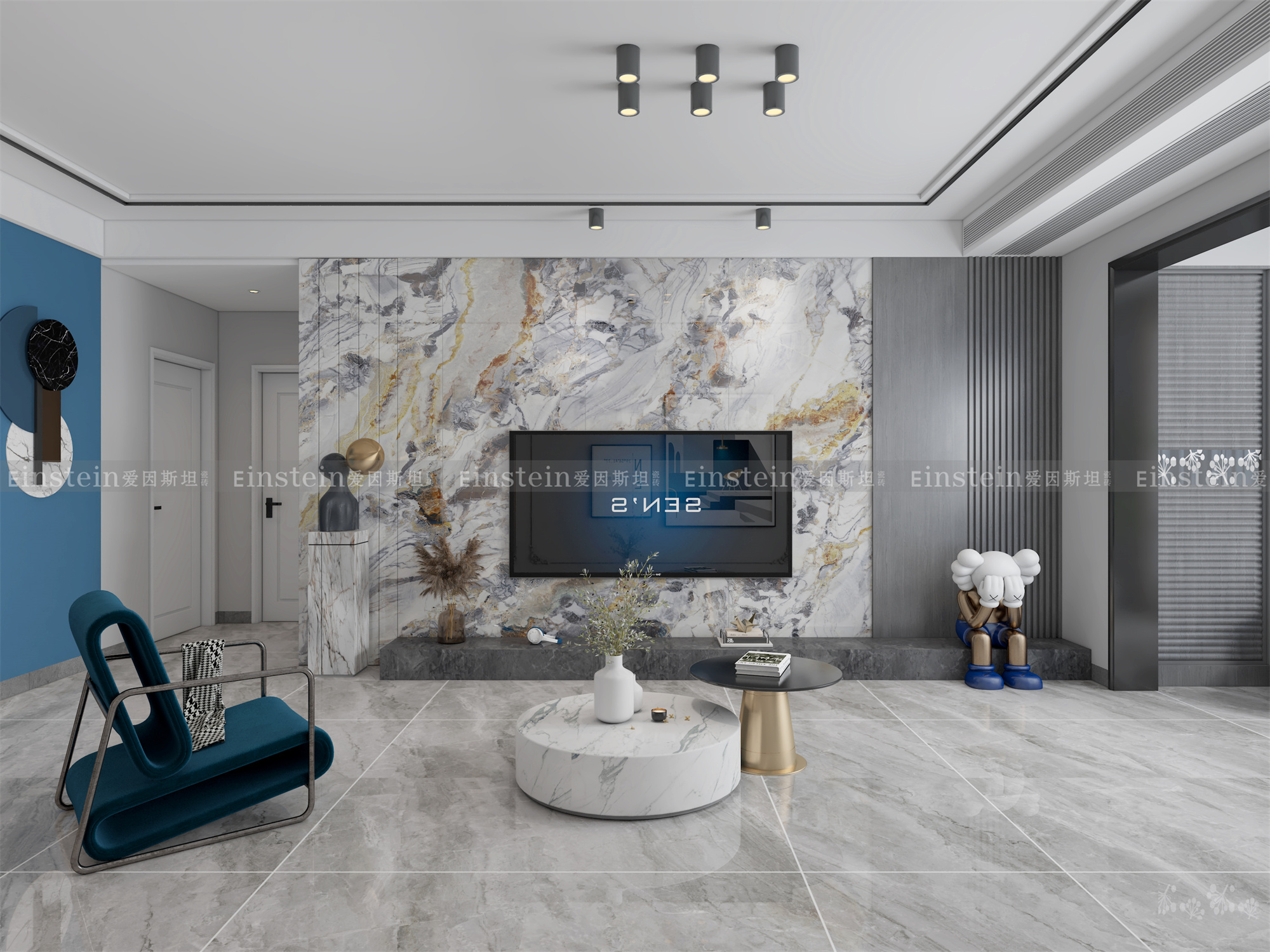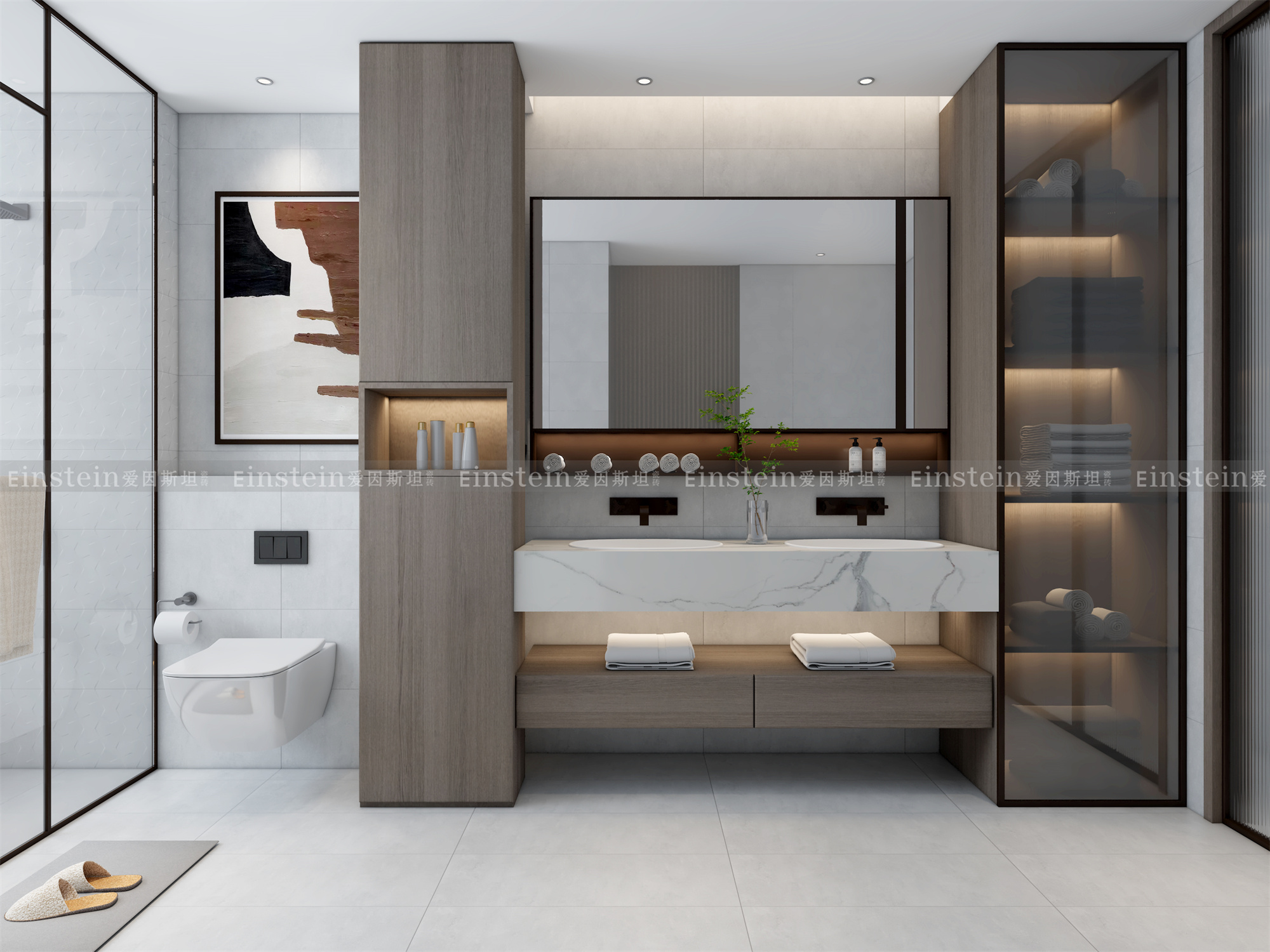 选用爱因斯坦瓷砖岩板背景墙系列冷翡翠、莫奈原石系列尼斯灰、珠光幻彩系列晨曦灰、瓷片系列科拉尔,利用不同色系、纹理的瓷砖进行色彩搭配,营造出沉稳的生活品质。一步一景,细微之处见极致。