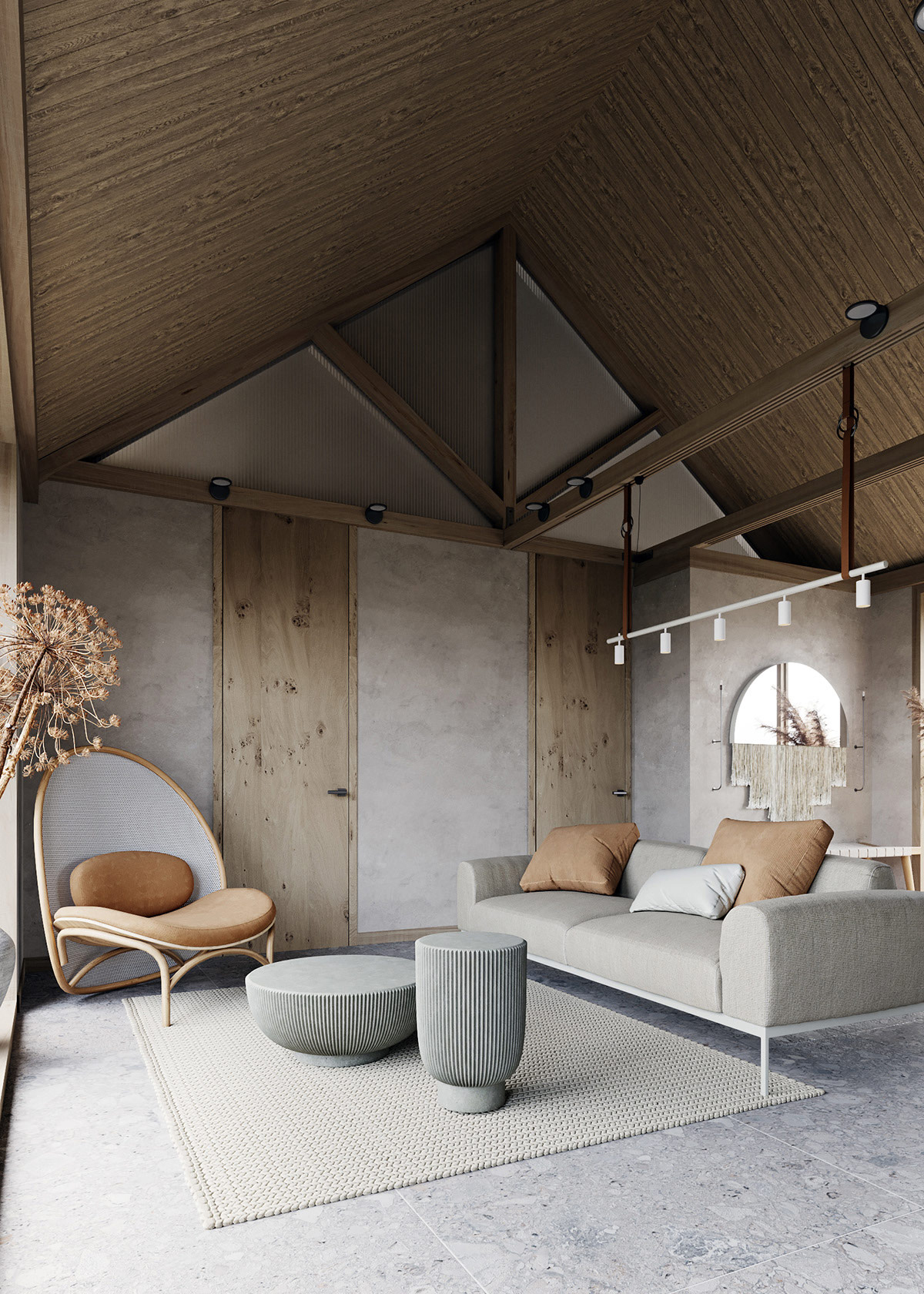 与传统的中式对称美学不同,侘寂风主张“不经意,随性”。所以在布局上,我们一般以满足基础的功能为主,将布局做到极简,适当的给空间做留白,营造至简至美的侘寂风美感。