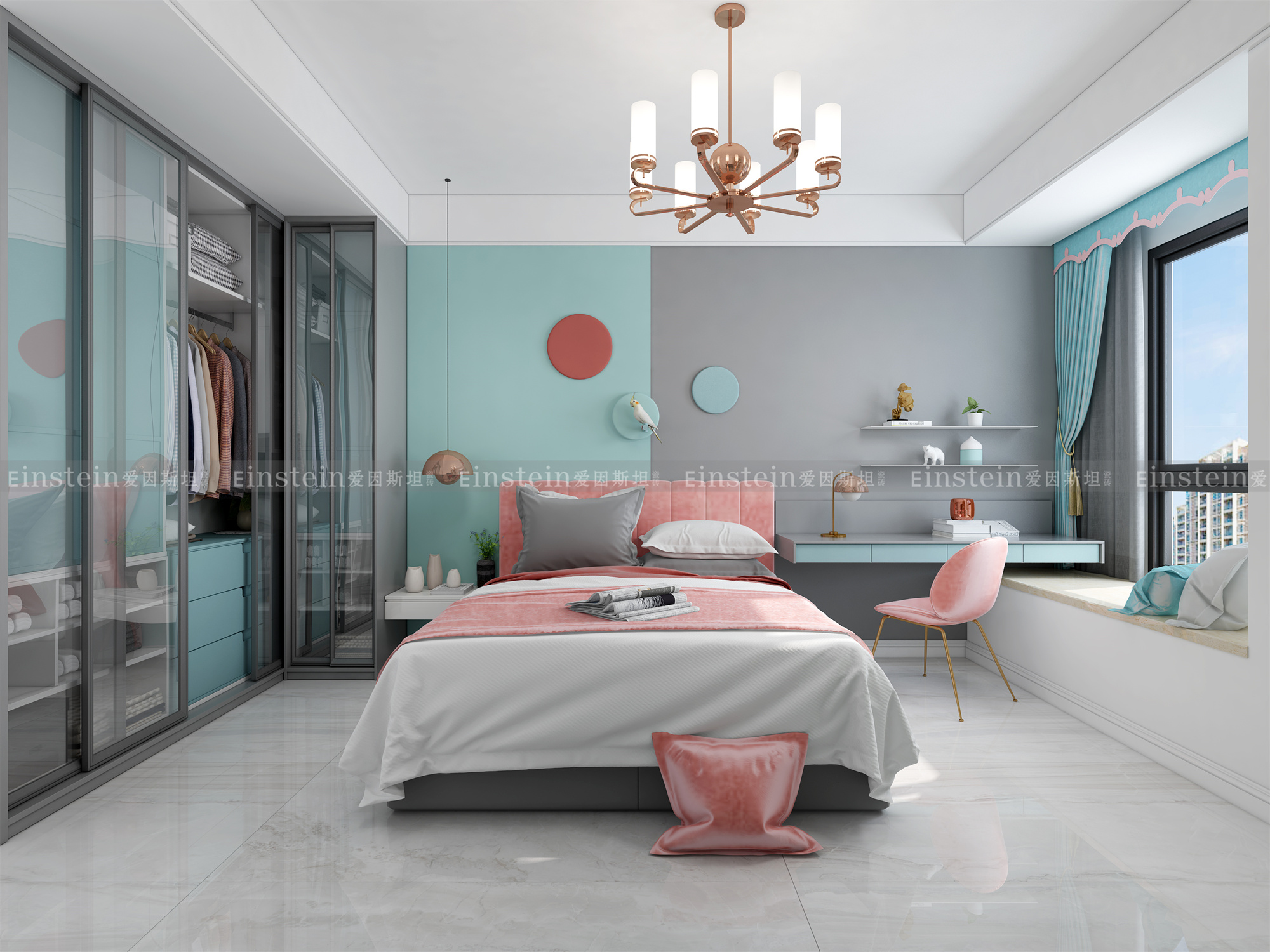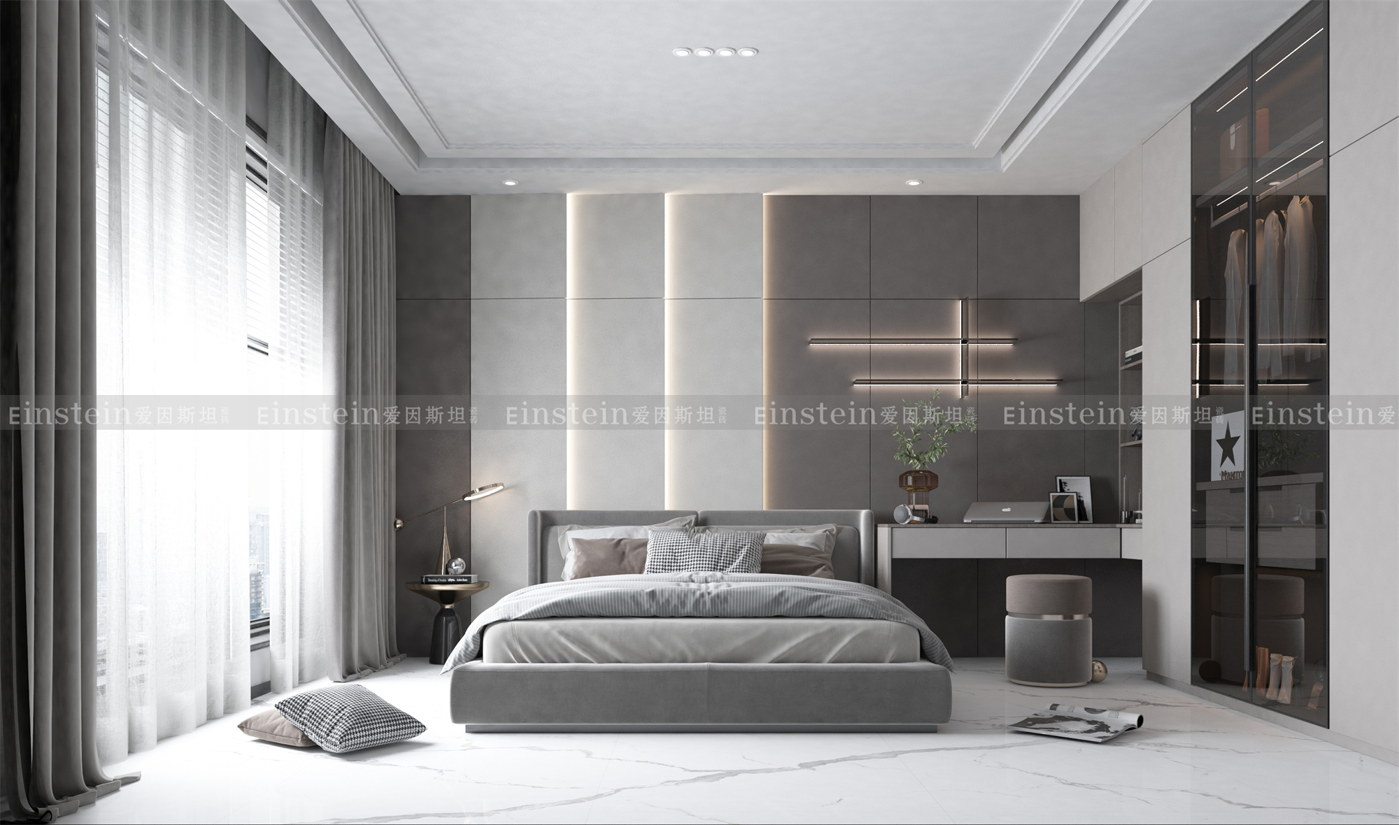 灰色调的软饰,让空间变得轻盈,舒适;与同为中性色的白色地面搭配,超白如雪的装饰效果,营造出洁白高雅、清纯宁静的世界,非常适合卧室里使用。