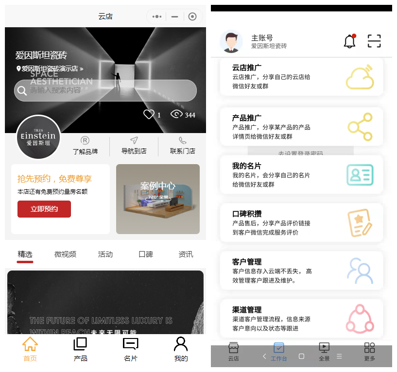 2022年初,爱因斯坦瓷砖与助店通达成战略合作。让终端经销商能够拥有一个集线上云店、营销活动管理、推广获客、客户管理、VR铺贴设计、口碑管理为一体的门店营销、销售管理系统。让终端经销商实现门店营销、销售管理能力提升,从而给门店带来业务增长。同时,也能够助力终端经销商把产品做透、把服务做做强,从单一产品销售转变为给予消费者惊喜的一站式解决方案,进而快速提升品牌和自身的市场竞争力和影响力。