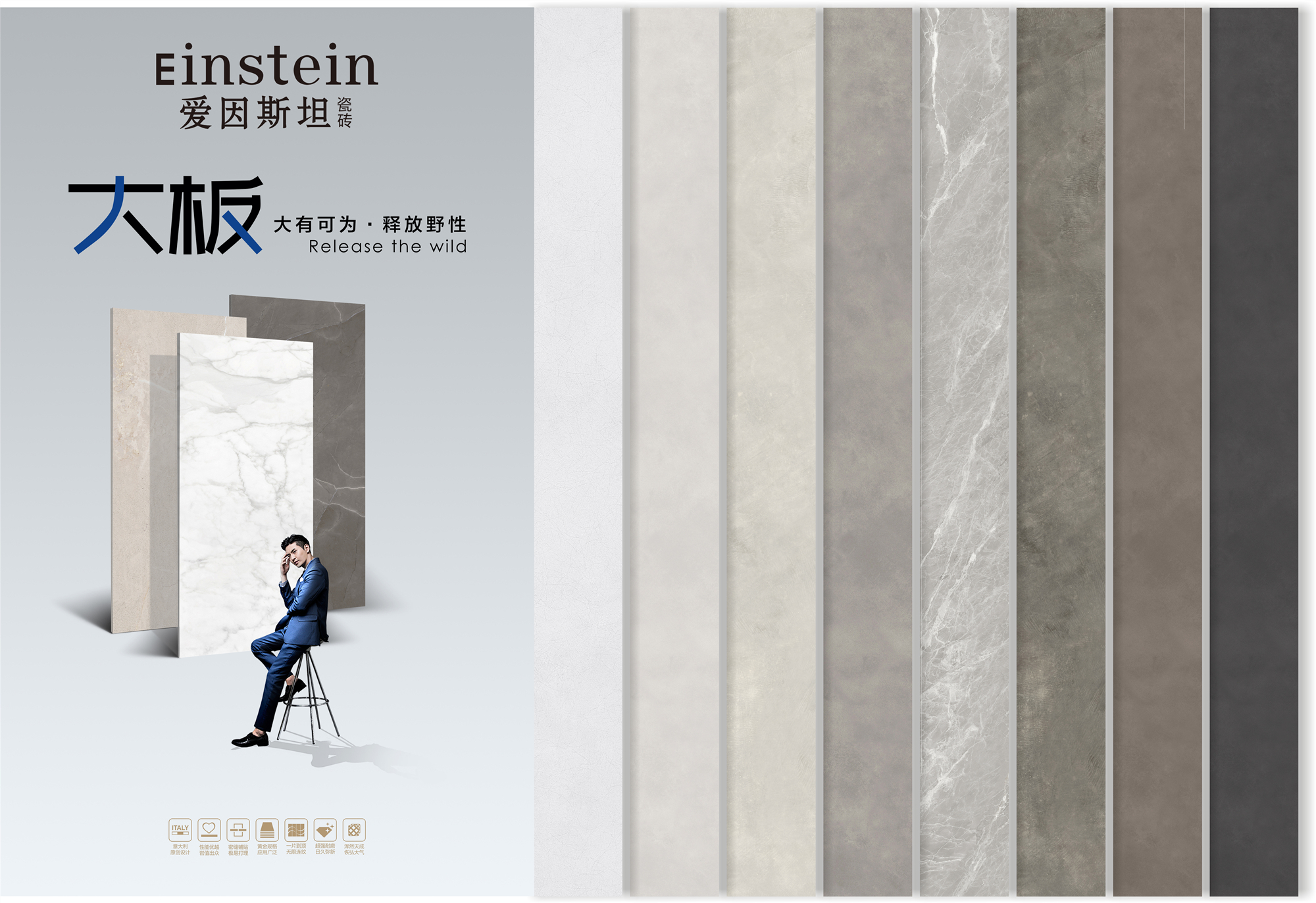 爱因斯坦瓷砖以核心消费群体的生活方式出发。从产品的外观、质感、功能等方面,着力精研更符合消费者需要的优质产品。推出一系列以大理石、水泥、木纹、皮毛、重金属等天然材质质感为基底的高颜值、高质感、高级感的新品。在肌理表达、产品应用上融入巧思,力求让每一款产品都能得到客户的满意。